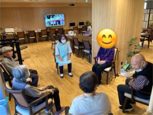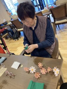 機能訓練では、体が少しずつ動きやすくなってきたと喜ばれる場面もあり、ボールを使った上肢・下肢の体操では可動域の広がりが感じられました。写真では、ボール体操に励まれる姿と、完成に向けて秋桜を丁寧に作っている様子をご紹介しています。