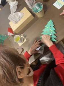 12月のクリスマス会に向けた準備が進み、フロアには楽しげな空気が広がっていました。特に飾りつけの制作では、細い線に沿って丁寧に切り進めたり、「こんな感じでどうかな」と作品の形を確かめながら取り組む姿が多く見られました。完成した飾りを手にすると、皆さんの表情がふっと明るくなるのがとても印象的でした。