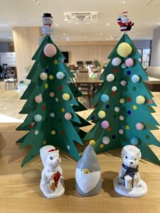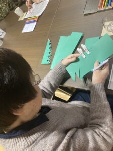 12月のクリスマス会に向けた準備が進み、フロアには楽しげな空気が広がっていました。特に飾りつけの制作では、細い線に沿って丁寧に切り進めたり、「こんな感じでどうかな」と作品の形を確かめながら取り組む姿が多く見られました。完成した飾りを手にすると、皆さんの表情がふっと明るくなるのがとても印象的でした。