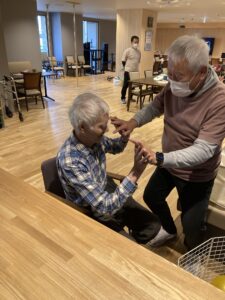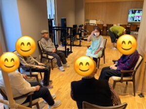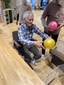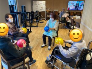 機能訓練では、体が少しずつ動きやすくなってきたと喜ばれる場面もあり、ボールを使った上肢・下肢の体操では可動域の広がりが感じられました。写真では、ボール体操に励まれる姿と、完成に向けて秋桜を丁寧に作っている様子をご紹介しています。